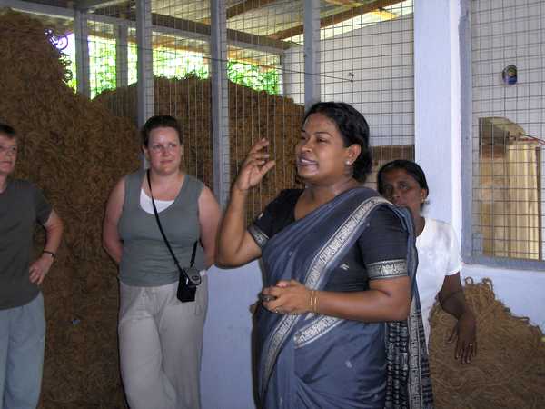 We moved on to the Community Centre at Wenemulla, funded by ActionAid. Here coir yarn is collected, graded and priced. Over the last 26 years, the Siyath Foundation has helped to establish and coordinate a 3,000+ network of coir workers, women who work, often in family groups, spinning yarn out of coconut husks. Homeworkers are women, economically and socially disadvantaged - there is significant domestic abuse and a caste system which, though not as evident as in India, still exists. Siyath has supported the coir workers to get a better price for their products through cooperatives which fix the price of the coir or by making the yarn into products such a mats which are then sold in the UK, USA and Germany through Fair Trade networks.